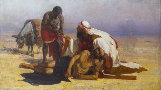 "Милосердный самарянин", Василий Суриков, 1874. В центре картины - три персонажа. Несчастный человек, самарянин и чернокожий раб. Вдалеке видны очертания фигуры удаляющегося левита. Бело-оранжевое небо слепит глаза, раскаленная от солнца пустая безжизненная земля. Вокруг ни души. Оказавшегося здесь, избитого и обобранного путника ждала бы неминуемая смерть, если бы не пришедший вовремя самарянин, который помог несчастному человеку добраться до гостиницы, да еще заплатил гостиничнику, чтобы тот присмотрел за больным и обеспечил ему необходимый уход...