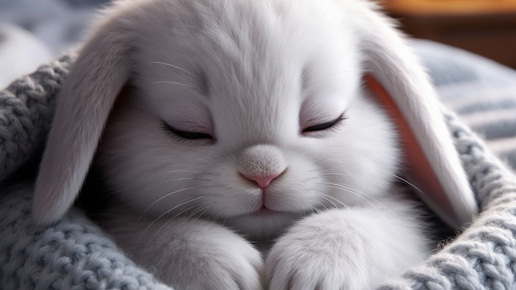 "Сонное, невероятно мягкое, маленькое пушистое создание, похожее на крольчонка, с большими, полуприкрытыми, мечтательными глазами цвета лаванды и пушистой светло-серой шёрсткой. Его ушки опущены вниз, а хвостик представляет собой крошечный пушистый пушок. У него маленький розовый, слегка подрагивающий носик и довольное выражение лица с закрытым ртом. Существо завернулось в уютное вязаное одеяло большого размера, а от прикроватной лампы исходит мягкое, тёплое сияние...