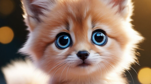 " Пушистое, очаровательное маленькое создание, напоминающее лисёнка, с большими, невинными, искрящимися голубыми глазами и мягким мехом кремового цвета с тонкими персиковыми оттенками. Его ушки слегка приподняты, а хвост пушистый и завитый. У него крошечный, влажный, чёрный носик и нежный, слегка приоткрытый ротик, выражающий любопытство и нежность. Существо сидит на ложе из мягких, пастельно-розовых лепестков роз, на фоне тёплого, рассеянного золотистого света...