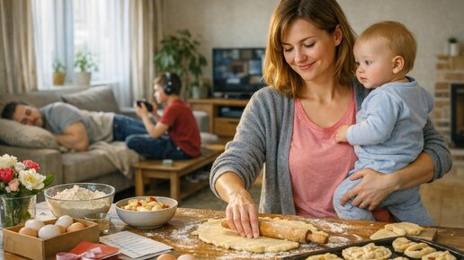 Представьте сцену. 8 марта, девять утра. Женщина с ребёнком на руках печёт пироги для школьного мероприятия. Муж спит. Старший сын играет в приставку. А ей нужно успеть: испечь, собрать ребёнка, отвести в школу на утренник, вернуться, приготовить праздничный обед для семьи. И да, это её праздник. Её день. Вот парадокс 8 марта для матерей. С одной стороны, это день, когда их должны поздравлять, баловать, освобождать от обязанностей. С другой — именно матери организуют праздник для детей, готовят, убирают, делают так, чтобы всем было хорошо...