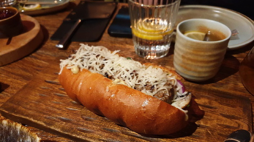 А не прикупить ли мне на зиму куртку-аляску? :) Примерно месяц назад мы вчетвером, я с Таней, а Илюша со знакомым гастро-энтузиастом, отужинали в ресторане-гастробаре "Аляска", расположенном по адресу: гор. Москва, Бобров пер., дом 4, стр. 1. Рейтинг на "Яндекс. Картах" — 4.9. Московской "Аляске" около шести лет, первый "родительский" ресторан родом из Магадана. Думаю, что все знают залихватскую песню группы "Не валяй дурака, Америка!... что Сибирь, что Аляска — два берега" группы "Любэ". Там есть слова: Много красной у нас материи,