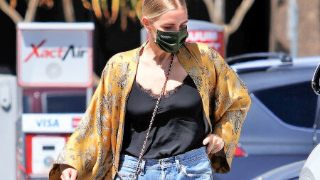 Как сделать простой топ и джинсы ярче: модная Эшли Симпсон в необычном халате-кимоно