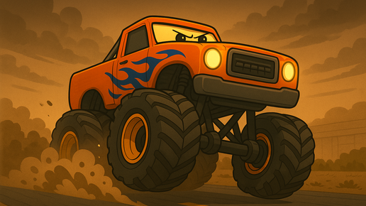 В городе Автограде всё было спокойно. Машинки катались по улицам, в автосервисах весело жужжали гайковёрты, а тяжёлые грузовики мирно дремали на стоянке. Но однажды... всё изменилось. — БРРРААААХ! — прогремел громкий рёв! Из пыльного гаража вылетел... гигантский монстр-трак! Его колёса были выше пожарной машины, капот - как большой грузовик, а выхлопные трубы пыхтели густым дымом и огнём. Это был ГИГА-ТРАК, огромная машина, о которой все давно забыли. Говорили, что он спит в дальнем гараже за городом и просыпается только тогда, когда кому-то нужна помощь...