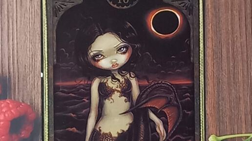 О Русалке Затмения : Эта прекрасная Русалка затмения плавает в бушующем красном море, наблюдая и ощущая, как происходит мощное изменение энергии. Она купается в энергии и взаимодействует с ней, но она не пытается направлять эту энергию или заставить её течь в определенном направлении. Она уже приготовилась и движется вместе с энергией, но это не требует от неё усилий. В этот момент Русалка остаётся спокойной, очень умиротворённой, но при этом наблюдательной и бдительной. В её глазах отражается энергия затмения (упадка), а всё спрятанное внутри неё будет проявляться наружу...
