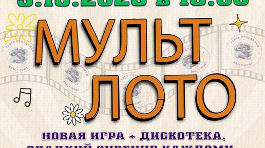✨ СЕГОДНЯ📢 МУЛЬТЛОТО БИЛЕТ МОЖНО КУПИТЬ ПЕРЕД МЕРОПРИЯТИЕМ, ПРИХОДИТЕ ЗА ХОРОШИМ НАСТРОЕНИЕМ 🥰1,5 часа удовольствия игры для начальной школы 📝 + игра с карточками как наше доброе русское лото 📺 + фрагменты любимых мультов разных времён 🎤+ весёлые ведущие 👦👧 + новые знакомства 💃+ дискотека 🍭+ призы всем участникам 🏆 + супер-приз ПОБЕДИТЕЛЮ 🚫 Возраст: 6+ 📆 05...