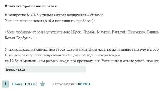 В кодировке КОИ-8 каждый символ кодируется 8 битами. Ученик написал текст (в нём нет лишних пробелов): «Мои любимые герои мультфильмов: Шрек, Пумба, Маугли, Рататуй, Пиноккио, Винни-Пух, Белоснежка, Малефисента, Человек-паук, Конёк-Горбунок». Ученик удалил из списка имя героя одного мультфильма, а также лишние запятую и пробел – два пробела не должны идти подряд. При этом размер нового предложения в данной кодировке оказался