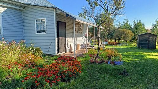 Наверное, впервые в жизни я жду промозглой осени - той поры, когда все огородные заботы позади и выходить из дома не хочется, а, благодаря тяге нашей собачонки Мани к прогулкам, надо... Но пока погода не торопится, лаская клумбы, которые светятся огоньками по всей перспективе парадного въезда... и мне нравится переводить взгляд с маленькой клумбы возле входа в теплицу на полукруг с буйством махровой космеи под окошком... на очаги обожженных утренниками колеусов в горшках и доцветающих календул в круге под старым тёрном...