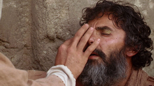 По дороге Иисус увидел человека, который был слеп от рождения. Ученики Иисуса спросили Его: «Учитель, раз он родился слепым, то кто согрешил: он сам или его родители?» Иисус ответил: «Не согрешил ни он, ни его родители, но родился он слепым для того, чтобы Бог проявил Свои дела в нём. Пока ещё день, мы должны совершать дела Пославшего Меня. Когда приходит ночь, никто не может работать. Пока Я в мире, Я — Свет мира». Сказав это, Он плюнул на землю, сделал грязь, смешав слюну с пылью, помазал ею глаза слепого, а затем сказал ему: «Пойди, умойся в купальне Силоам!» — что означает «посланный»...