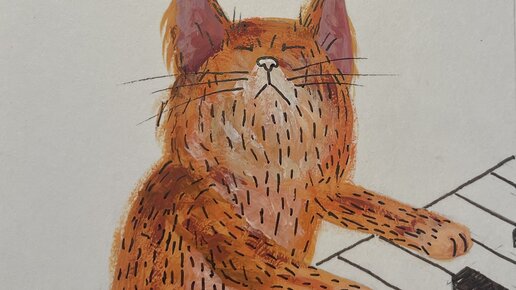 Намечаем на листе расположение кота и пианино. Рисуем клавиши так, чтобы у черных клавиш была видна их высота. Закрашиваем кота основным рыжим цветом (можно небрежно, так мазки будут похожи на шерсть). Добавляем более темный оттенок в окрас кота. Теперь более коричневым цветом проходимся по самым темным местам...