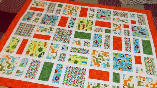 Хочу сегодня показать вам, как сшить детское одеялко просто из цветных квадратов и прямоугольников. Шила я его давно, и даже было описание где-то в Интернете. Но тогда я его не сохранила, а теперь не нашла. На самом деле, принцип, использованный в этом одеяле, широко применяется для одеял любого размера. Только вид блоков меняется. А началось всё с двух кусочков тканей детских расцветок размером 45х50см, которые мне подарили. И, как вы понимаете, сшить из него можно было только что-то детское. Но даже на детское одеяло этих тканей, конечно же, не хватало...