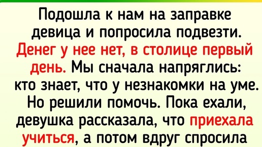 Подошла к нам на заправке девица и попросила подвезти. Денег у нее нет, в столице первый день, едет на собеседование, здесь не ориентируется. На вид лет 20. Мы сначала напряглись: кто знает, что у незнакомки на уме. Но решили помочь: выглядела и общалась она как божий одуванчик. Пока ехали, девушка рассказала, что приехала учиться, а сейчас едет устраиваться на подработку. А потом вдруг спросила: «А как жить в столице и не потерять себя?» Я чуть кофе не поперхнулась, а муж начал что-то рассказывать...