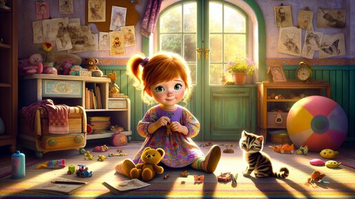 Маша-растеряша, маленькая девочка с забавным хвостиком и россыпью веснушек на носу, сидела в своей комнате, одетая в любимое платье с разноцветными бабочками. Её комната была настоящим царством фантазии: полки с книгами, яркие игрушки на полу, а стены украшены рисунками, которые она нарисовала сама. Но этим чудесным утром случилось нечто ужасное для Маши – она не могла найти своего любимого плюшевого мишку. Она перевернула подушки на кровати и заглянула под неё, рыскала по полкам и по всем коробкам с игрушками, но результата не было...