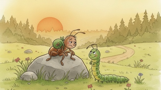 Залез Муравей на берёзу. Долез до вершины, посмотрел вниз, а там, на земле, его родной муравейник чуть виден. Муравьишка сел на листок и думает: «Отдохну немножко — и вниз». У Муравьёв ведь строго: только солнышко на закат — все домой бегут. Сядет солнце — муравьи все ходы и выходы закроют — и спать. А кто опоздал, тот хоть на улице ночуй. Солнце уже к лесу спускалось. Муравей сидит на листке и думает: «Ничего, поспею: вниз ведь скорей». А листок был плохой: жёлтый, сухой. Дунул ветер и сорвал его с ветки...