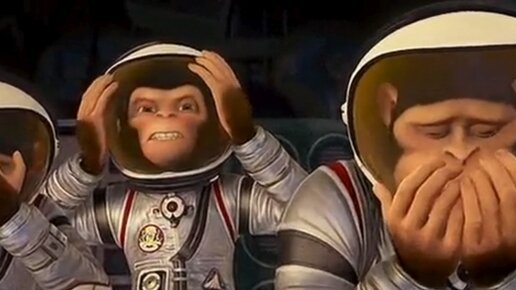 В 2008 г. американская студия Вангард Энимэйшн выпустила полнометражный анимационный мультфильм «Space Chimps» (дословно «космические шимпанзе»). В русскоязычном прокате фильм назвали «Мартышки в космосе» (шимпанзе, конечно, не являются мартышками, но переводчики могут себе позволить не разбираться в систематике приматов). Мультфильм, честно говоря, не выдающийся, хотя зрители любого возраста могут найти в нем что-то забавное. Например, множество аллюзий на космические саги: «Космическая Одиссея 2001», «Стар Трек» и, конечно, «Планета Обезьян»...