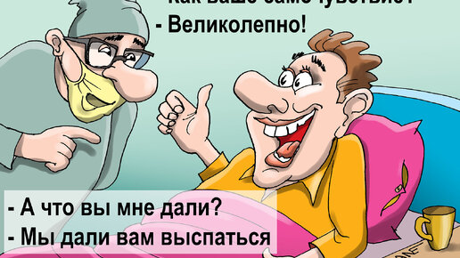 Анекдоты с карикатурами5 лет назадПодписатьсяСон – лучшее лекарствоАнекдот про сон как лекарство - Как ваше самочувствие? - Великолепно! - А что вы мне дали?