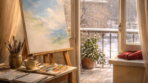 Часть 2 Март 2025 года. Год назад. Ольга стояла в своей комнате, смотрела на угол за шкафом. Там, в пыли и темноте, стоял мольберт. Двадцать пять лет. Она подошла. Взялась за раму. Потянула. Мольберт не поддавался — застрял. Ольга упёрлась ногой в стену, потянула сильнее. Дерево скрипнуло, сдвинулось. Ещё рывок — и мольберт вывалился, чуть не сбив её с ног. Старое дерево, потемневшее от времени. Пыль толстым слоем. Ольга взяла тряпку, начала вытирать. Пыль поднималась облаком, садилась на руки, на лицо...