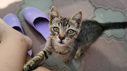 Семь дней мы провели в Дербенте, и в первый же вечер к нам пришло вот это создание. Кот, которого предварительно назвали Симба. Мы просто хотели его покормить, потом ребята поиграли с ним. Да так и остался... Пришёл он к нам грустным, ощипанным существом, у которого гноились глаза. Блохи кусали без конца. Котейке на вид 2 месяца, и можно представить, какая борьба за выживание предшествовала его появлению у нас. По повадкам видно до сих пор, что он привык клянчить еду, где-то даже воровать, наедаться впрок и не упускать шанс поживиться...