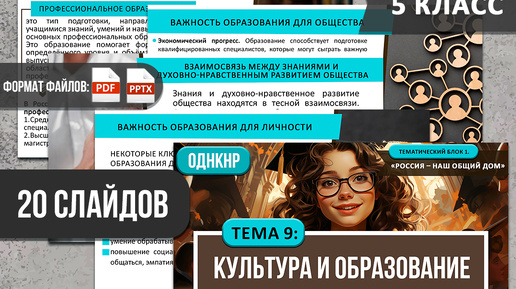 Презентация «Культура и образование» состоит из 20 слайдов. Создана по ФРП ООО «ОДНКНР для 5 классов», тематический блок 1. № п/п 1.9 (тема 9). Презентация аккуратно и красиво оформлена, насыщена информацией, доступна в PDF-формате и PPTX-формате. Содержание презентации «Культура и образование» по слайдам: Слайд 1. Тема: «Культура и образование». Слайд 2. Что такое культура? Слайд 3. Что такое образование? Слайд 4. Важность образования для личности. Слайд 5. Важность образования для общества. Слайд 6...