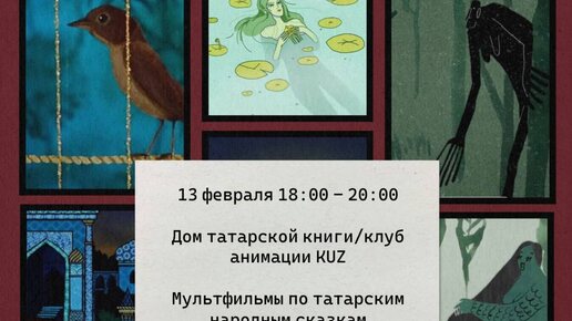 📚🎥 Показ и обсуждение состоится 13 февраля, приглашаются все желающие. 📝В программе: 🔹«Персонажи в татарской мифологии»: образовательный ролик о культуре и истории татарского народа; 🔹«Заяц-слуга»: татарская сказка о справедливости и смекалке; 🔹«Толкование сновидений»: умная притча о сне, который оказался пророческим; 🔹«Соловей»: трогательная история о свободе; 🔹«Су анасы»: анимация по мотивам одноимённой сказки Г...