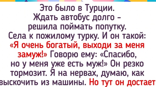 Есть такие ситуации, которые из памяти никаким ластиком не сотрешь. Они оставляют в сердцах людей настолько сильный эмоциональный след, что и спустя годы вспоминаются во всех подробностях, будто произошли вчера. Причем даже не важно, было ли событие со знаком «минус» или со знаком «плюс» — главное, что оно впечатлило до глубины души. Это было в Турции. Ждать автобус долго — решила поймать попутку. Села к пожилому турку. И он такой: «Я очень богатый, выходи за меня замуж!» Говорю ему: «Спасибо, но у меня уже есть муж!» Он резко тормозит...