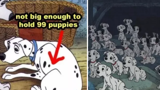 1. Как две собаки смогут воспитать 99 щенков в мультфильме "101 далматинец" ? 2. Почему во всем королевстве только у Золушки такой маленький размер обуви? 3. Почему Белль не узнала принца Адама в «Красавице и чудовище», когда он буквально превратился в принца прямо перед ее глазами? 4. Как Покахонтас и все ее племя могли говорить по-английски, если они никогда раньше не встречали белых людей? 5. Где, черт возьми, соски Аладдина ?!