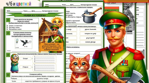 Рабочий лист "Каша из топора" 2 класс Литературное чтение Русская народная сказка ✨с ОТВЕТАМИ для учителя✨МОЖНО РЕДАКТИРОВАТЬ✨ Задания размещены на 2-х листах ( можно использовать двухстороннюю печать для экономии бумаги) ДВА ФАЙЛА ДЛЯ ПЕЧАТИ НА ВАШ ВЫБОР : ЦВЕТНОЙ И ЧЕРНО-БЕЛЫЙ. Формат pdf и формат pptx ( с возможностью редактирования файла) Иллюстрации в высоком разрешении...