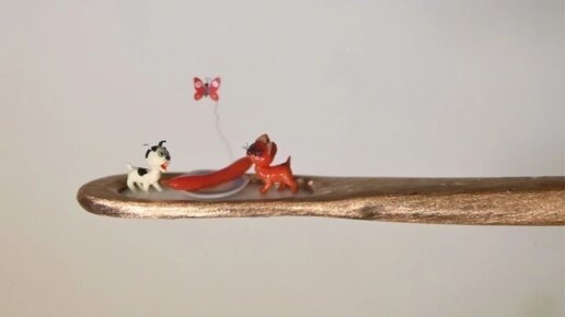 Как пишет VN.ru, микроминиатюрист левша Владимир Анискин из Новосибирска создал миниатюру с героями мультика про котёнка Гава. Котёнок Гав и щенок Шарик сидят в ухе золотой иглы. Они охраняют сосиску и следят за бабочкой. По словам мастера, работа заняла неделю, но трудиться пришлось по 10 часов в день...