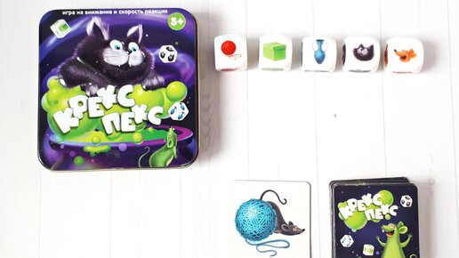 Всем привет! Последняя игра из серии "Игры в табакерке" от Десятого королевства у меня - Крекс пекс. Это аналог всем известной игры "Барабашка". Исполнение очень качественное. Плотные, хоть и крошечные карты. Веселый сюжет про кота и мышонка. Перед началом игры все карты перемешиваются и кладутся стопкой. Все кубики кладутся на стол, чтобы любой игрок мог до них дотянуться. Первый игрок переворачивает верхнюю карту и все дружно смотрят вычисляя какой кубик нужно схватить. 1. Изображение на карте такое же, как и на кубике (совпадает цвет и предмет, т...