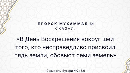 Пророк Мухаммад ﷺ сказал: «В День Воскрешения [в знак очевидности, тяжести и пагубности греха] вокруг шеи того, кто несправедливо присвоил [себе даже] пядь [чужой] земли, обовьют [объем почвы этого куска...