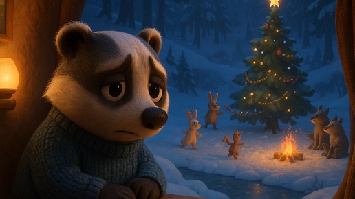 Барсучок Боря жил глубоко в лесной чаще. Его домик находился на высоком холме, окружённом густым лесом и покрытой льдом речушкой. Жизнь у Бори была тихая и спокойная, однако приближался Новый Год, и одиночество ощущалось особенно остро...