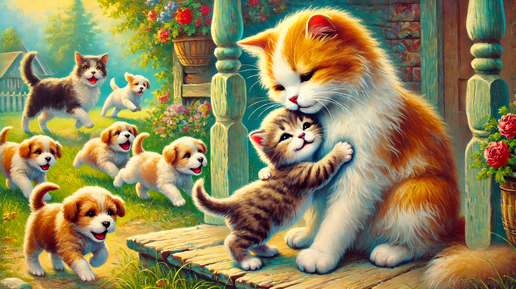 Жил-был маленький котёнок по имени Мурчик, он был самым пушистым и милым котёнком на свете. У Мурчика была мама-кошка, которая очень любила его. Когда мама была рядом, котенку было тепло, уютно и совсем не страшно. Мама кормила его тёплым молочком, ласково мурлыкала, когда он засыпал, и обнимала своим мягким хвостиком. Но каждый раз, когда мама уходила по своим кошачьим делам, Мурчик просыпался и не видел её рядом, ему становилось грустно и страшно, он начинал тихонько мяукать: «Не уходи, мама. Я боюсь один»...