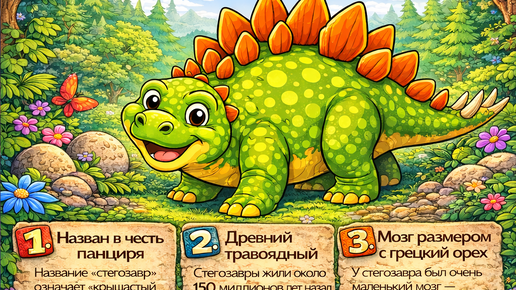 Его невозможно перепутать с другими благодаря большим пластинам на спине и грозному хвосту. Вот несколько интересных фактов о нём: Стегозавр был травоядным и питался папоротниками, хвощами и другой древней растительностью. Он жил около 150 миллионов лет назад, в то же время, когда по Земле бродили другие знаменитые динозавры. Несмотря на большие размеры (до 9 метров в длину), мозг у стегозавра был совсем маленьким — примерно с грецкий орех. Костяные пластины на спине помогали охлаждать тело и, возможно, служили для устрашения врагов...