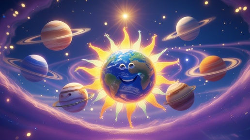 В далёком-далёком космосе, где звёзды мерцают, как бриллианты, жила-была маленькая, но очень гордая планета по имени Земля. Она была покрыта зелёными лесами, голубыми океанами и высокими горами. Земля была очень счастлива, но иногда чувствовала себя одиноко. Однажды Земля посмотрела вверх и увидела яркое, тёплое Солнце. Солнце было центром всей Солнечной системы, и вокруг него вращались другие планеты: Меркурий, Венера, Марс, Юпитер, Сатурн, Уран и Нептун. Земля очень захотела подружиться с Солнцем и другими планетами...