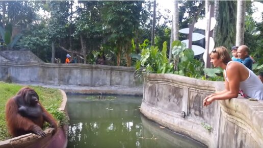 Ролик взят https://www.youtube.com/watch?v=iOTJ0d097oI Видео снято в одном из азиатских зоопарков. Скорее всего действие происходит в популярном. у наших туристов Тайланде. Как обычно, посещая заграничный зоопарк, "дикие русские туристы" начинают дразнить местных животных. На видео показано, как русский турист, бросает какую-то вкусняшку орангутангу и просит бросить, что-нибудь в ответ...