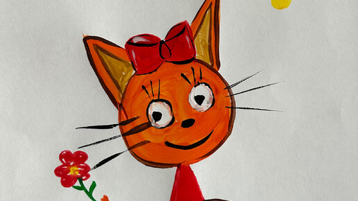 Да, речь идет не о еде) И ребята наверняка уже догадались, что это герои мультфильма «Три кота». Сегодня будем рисовать их😽😺😸. Для начала можно дать детям выбор, кого они хотят нарисовать. Девочки, например, любят Карамельку. Хотя у меня девочки выбрали и Коржика) Чуть выше середины листа рисуем круг - голову и сразу закрашиваем оранжевым цветом, ушки не забываем. У Компота голова будет побольше. Под головой намечаем туловище: платье в виде треугольника для Карамельки, для Коржика и Компота рисуем прямоугольники...