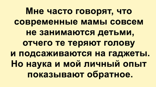 Меня зовут Настя, и у меня двое детей. Я много работаю, однако часто слышу от представителей старшего поколения, что современные мамы живут как на курорте, и за них все делают подгузники, мультиварка и робот-пылесос. Все жалобы, по их мнению, вызваны лишь ленью, а раньше женщины рожали прямо в поле. Самая частая претензия к родителям сегодня звучит так: «Вы просто не хотите заниматься своими детьми!» Я действительно хочу, но у меня есть и другая жизнь, помимо детей. Например, в данный момент я пишу этот текст вместо того, чтобы играть с сыновьями...