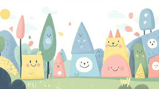 Создано на основе запроса: cute cartoon scene for teaching basic math concepts to young kids, tall and short characters like animals or trees standing next to each other, open and closed shapes drawn like happy creatures, friendly geometric shapes like smiling circle, square, triangle with eyes and faces, soft pastel colors, dreamy magical land, no numbers, no text, very child-friendly style, for kids under 8 years old, wide background --- Автоперевод: Симпатичная...