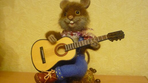 Думаю, что все смотрели в детстве замечательный мультфильм про Мышонка-задаваку. Про того, который пел: "Какой хороший день, какой хороший пень..." Он был такой стиляга, с гитарой. Работать не хотел и только и делал что играл на гитаре и хвалил себя песенкой "Какой хороший Я и песенка МОЯ!" Вспомнили? Когда-то, лет 12 назад, мне удалось приобрести 2 журнала, приложением к которым были маленькая скрипочка и гитара. Скрипочку я давно пристроила - на ней играет мой валяный Сверчок-музыкант. Его можно посмотреть на фото в одной из статей этого блога...