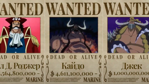 10. Джек - 1,000,000,000 9. Катакури - 1,О57,000,000 8. Куин - 1,320,000,000 7. Луффи - 1,500,000,000 6. Маршал Д. Тич - 2,247,000,000 5. Шанкс - 4,048,900,000 4. Шарлотта ЛинЛин - 4,388,000,000 3. Кайдо - 4,611,100,000 2...