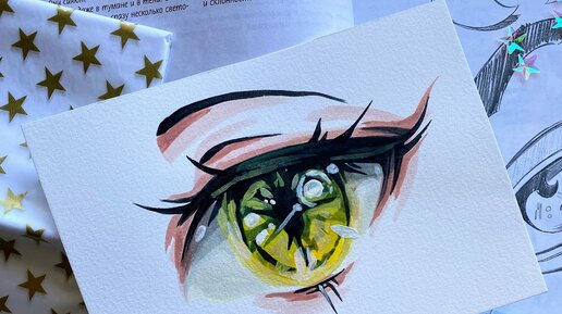 Этап 1. Композиция Создаем общую конструкцию глаза. Посередине листа намечаем вертикальный овал, а внутри него овал поменьше. Сверху, немного обрезав овал, наклоненной линией отмечаем верхнее веко, делаем его чуть толще (так реснички покажем потом). Парой линий слева справа и снизу пометьте общие размеры глаза. На подвижным верхним веком есть складка и бровь. Отмечайте линии более угловато, ведь у нас стилизованная работа. Этап 2. Работа с цветом Работа с цветом будем в акварельной технике (я пишу акрилом, вы можете работать сумой акварелью)...