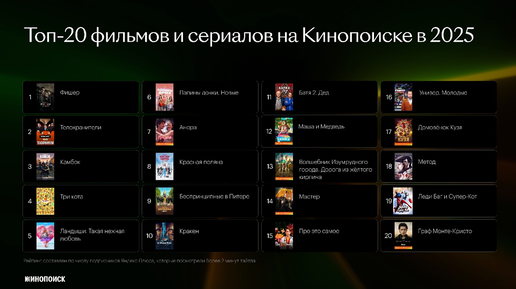 Сервисы и сайты подводят итоги года — от Кинопоиска тоже подъехали. Смотрим на топ-20 самых популярных фильмов, сериалов и мультфильмов по версии этого онлайн-кинотеатра: 1. «Фишер» 2. «Телохранители» 3. «Камбэк» 4. «Три кота» 5. «Ландыши. Такая нежная любовь» 6. «Папины дочки. Новые» 7. «Анора» 8. «Красная поляна» 9. «Беспринципные в Питере» 10. «Кракен» 11. «Батя 2. Дед» 12. «Маша и Медведь» 13. «Волшебник Изумрудного города. Дорога из желтого кирпича» 14. «Мастер» 15. «Про это самое» 16. «Универ...