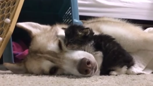 Маленький котёнок забыл о своём биологическом происхождении, идентифицируя себя в качестве собаки. Такое случается, если в роли родителя выступает крупный, но добрый пёс.