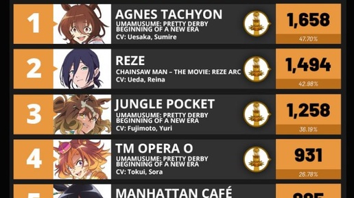 Для вас собрали топ самых популярных аниме-тянки 2025 года портал Anime Trending подвёл итоги года. В половине топа оказались девушки-лошадки из Umamusume: Pretty Derby, хотя второе место заняла Резе из «Человека-бензопилы». Топ-10: 1. Agnes Tachyon (Umamusume: Pretty Derby Beginning of a New Era); 2. Reze (Chainsaw Man - The Movie: Reze Arc); 3. Jungle Pocket (Umamusume: Pretty Derby Beginning of a New Era); 4...