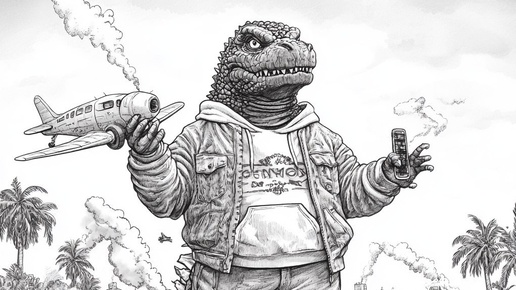 Создано на основе запроса: A black-and-white, hand-drawn cartoon in the style of a New Yorker cartoon. The scene shows Godzilla standing on a beach dressed like a Silicon Valley tech CEO: wearing a hoodie, slim-fit jeans, stylish sneakers, and sleek headphones. He is wreaking havoc in the coastal city and in one hand, it holds a small airplane like a toy; in the other hand, it holds a compact car with casual ease...