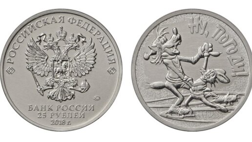 31 июля 2018 года Банк России выпустил в обращение памятные монеты «Ну, погоди!» серии «Российская (советская) мультипликация» в обычном исполнении (каталожный номер 5015-0025) и с цветным покрытием (каталожный номер 5015-0026). «Ну, погоди!» – советский и российский мультипликационный сериал, первый выпуск которого вышел в 1969 году. Режиссером Геннадием Сокольским была снята пилотная серия о Волке и Зайце, выпущенная в рамках альманаха «Веселая карусель». Основную часть сериала снял Владимир Котеночкин на студии «Союзмультфильм», роли озвучили Анатолий Папанов и Клара Румянова...