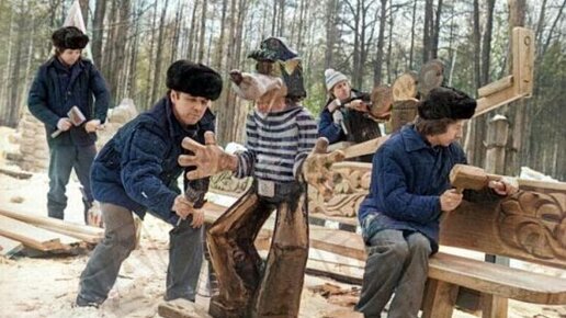 Резчики по дереву лесопаркового хозяйства Измайлово, 1981 год. Волк в тельняшке и клёшах из 7-й серии «Ну, погоди!» — культовый персонаж. Фото Г. Шпунькина 30 января 1970 года получил прокатное удостоверение мультфильм «Ну, погоди!», ставший хитом советского анимационного кино семидесятых. Конечно, я вырос с этим мультиком, мне каждый Новый год в те годы клали под ёлку в качестве подарка одну или две новые серии этого мультфильма, вышедшие за прошедший год (на катушках для кинопроектора), и мне он уже хотя бы поэтому нравился...