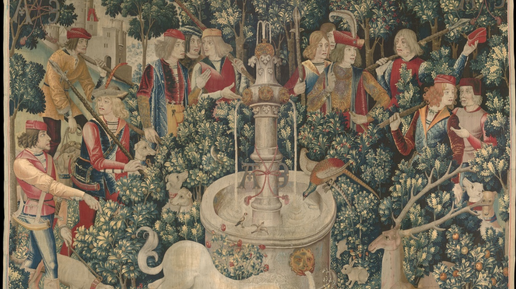 Гобелены с единорогом, широко известные как «Охота на Единорога», считаются одними из величайших произведений искусства, с этим точно не поспоришь. Серия состоит из семи монументальных гобеленов - они изображают изящно одетых дворян с командой охотников и гончих, которые преследуют единорога через цветущий лес. Существо найдено, убито, принесено в замок, и в знаменитой финальной панели сериала воскресает, отдыхает в саду за круглым забором. Наполненные особой глубиной пространства и светимостью, гобелены сотканы из шерстяных и шелковых нитей, некоторые из которых обернуты серебром или золотом...