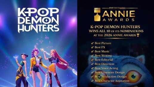 По сообщению издания Insight, анимационный фильм Netflix «Кей-поп-охотницы на демонов» завоевал 10 наград на 53-й церемонии Annie Awards, которую называют «Оскаром в мире анимации». Картина стала главным триумфатором вечера, одержав победу во всех категориях, в которых была номинирована, том числе за лучший полнометражный фильм, режиссуру, озвучивание, визуальные эффекты, дизайн персонажей, музыку и художественное оформление. Смотрите также: Звёзды «Кей-поп-охотниц на демонов» исполнили «Golden»...