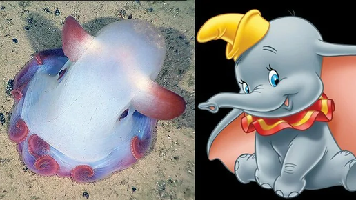 Морской мультяшка Как вы уже догадались название осьминог получил за сходство с диснеевским персонажем слонёнком Дамбо. Осьминог как будто летает с помощью ушей в толще воды. Параметры Глубина от 100 м до 5000 м (максимум 7000 м) Размер около 20 см (максимум 180 см) Большие глаза помогают только различать тени Плавники в виде ушей помогают делать перемещение плавным Щупальца и воронки обеспечивают перемещение Перемотайте на 6:00 и 12:45, чтобы увидеть осьминога Его сняла команда глубоководного корабля "Наутилус" при осмотре кораллов Южной части Тихого океана...