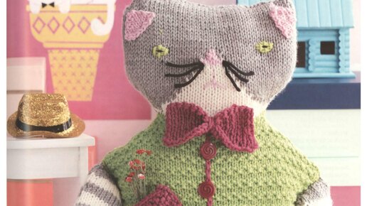 Изящная кошка Связанная из двух частей, эта полосатая серая кошка одета, чтобы произвести впечатление, в элегантный жилет и галстук-бабочку. ДИЗАЙН ЛОРИ СТЕЙНБЕРГ Плотность вязания: 16 петель и 24 ряда на 10 см лицевой гладью, спицами № 9 (5 мм). Проверьте плотность вязания. Размеры вязаного изделия: приблизительно 53,5 см в высоту от макушки до пят. Материалы: 2 мотка по 100 г (каждый примерно по 150 ярдов/138 м) пряжи Cascade Yarns 220 Superwash Aran (супервош мериносовая шерсть), каждый цвета: #817 Aran (A), #1946 Silver Gray (B) и #240 Jasmine Green (C)...